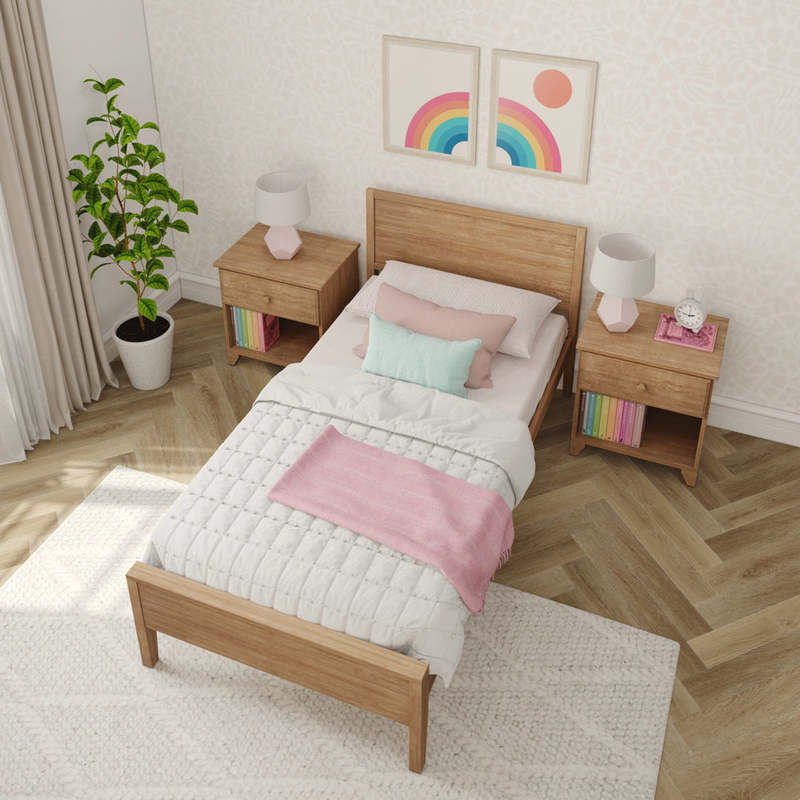 The slatted platform supports any standard twin mattress — no box spring needed — while allowing airflow for mattress longevity. A low-profile frame keeps younger sleepers safe and makes the bed easy to get in and out of. With natural wood grain detailing and a non-toxic, low-VOC finish, this bed is designed to be safe, stylish, and built to last.
