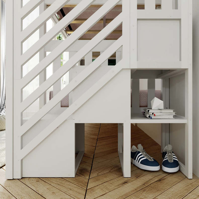 The staircase includes built-in cubbies, ideal for storing books, toys, clothes, or even baskets, eliminating the need for additional bedroom furniture. The stairs also provide wider steps with handrail support, offering a safer alternative to traditional ladders — perfect for young children and late-night bathroom trips.