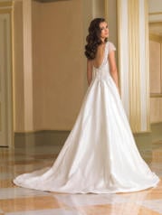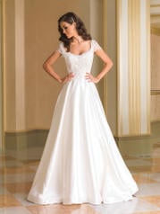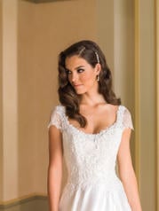 Fabric: Silk Dupion, Venice lace | Neckline: Scoop | Waistline: Dropped | Silhouette: Ball gown | Embellishments: Pearls and sequins on lace appliques | Dress Length: Floor | Train Length: Chapel